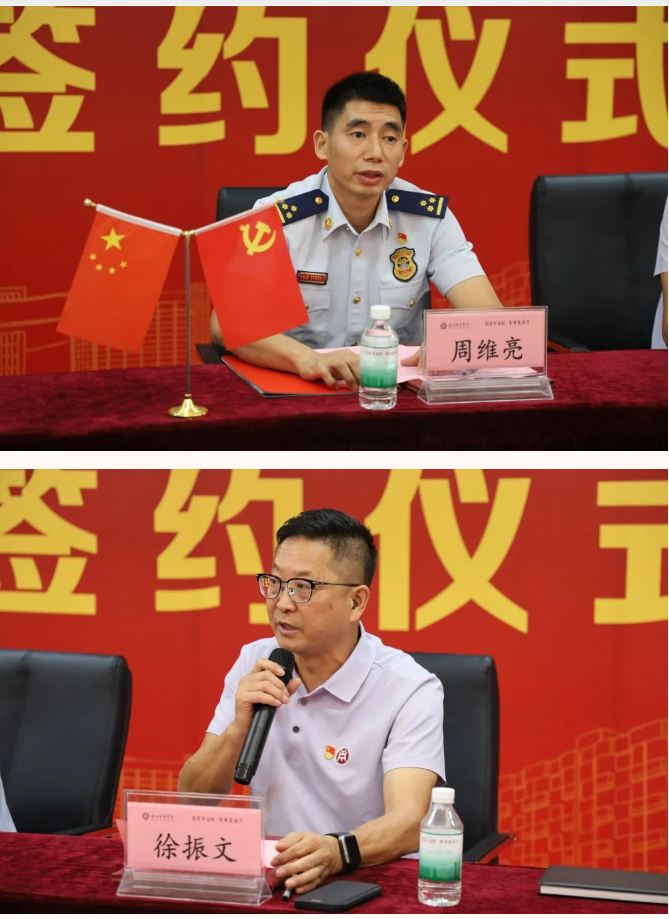 荔城消防救援站党支部书记周维亮与威廉希尔williamhill中文党总支书记徐振文在发言中提出了党建共建方式,共同表达了对未来三方党建共建的美好愿景和共聚合力、共谋新篇的坚定信心。